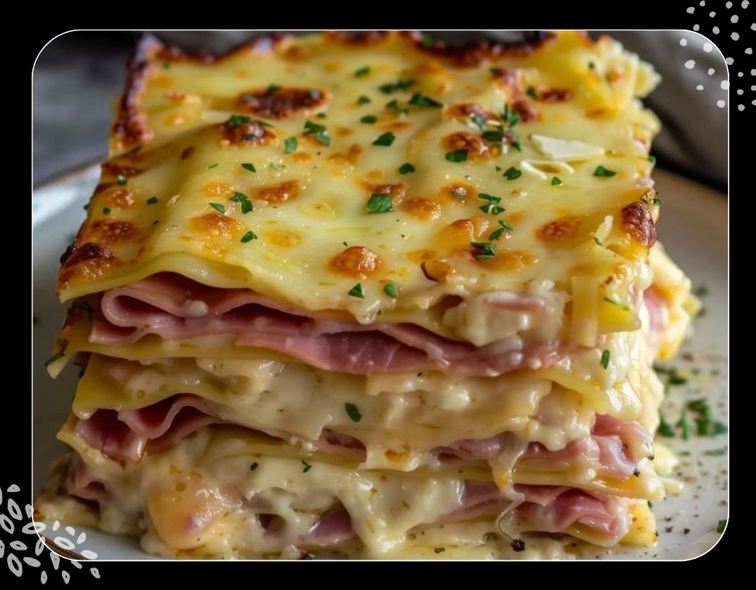 7- Répétez avec une autre couche de pâtes, 1/3 de la sauce restante, 2 tranches de jambon et du fromage à raclette.