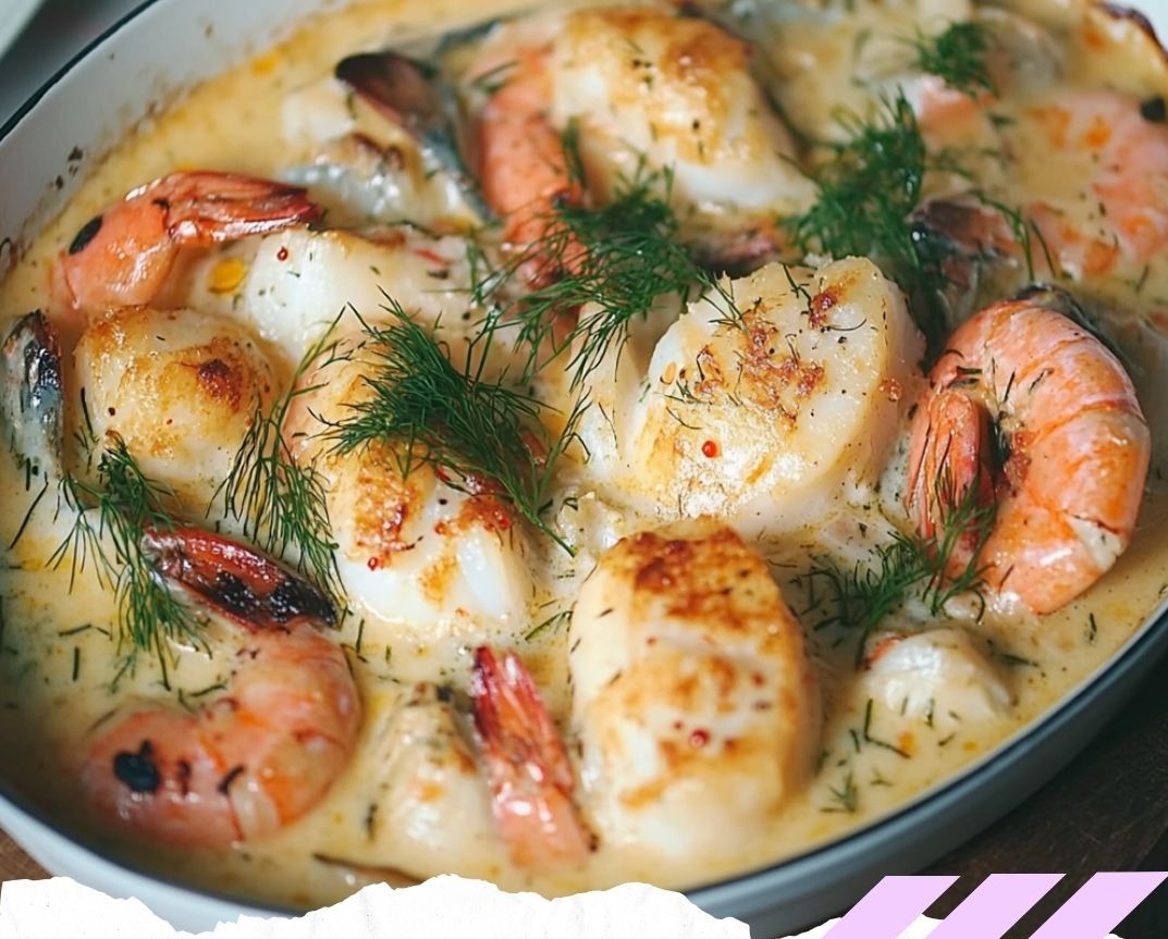 8- Dégustez votre délicieuse Cassolette de Poissons et Fruits de Mer avec une sauce crémeuse au vin blanc, safran et aneth !
