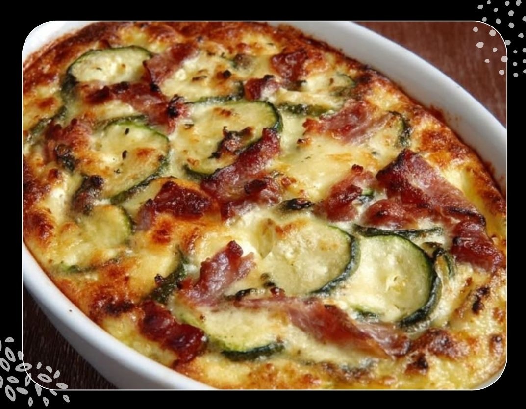 6- Répartissez les courgettes et lardons dans un plat à gratin légèrement huilé.