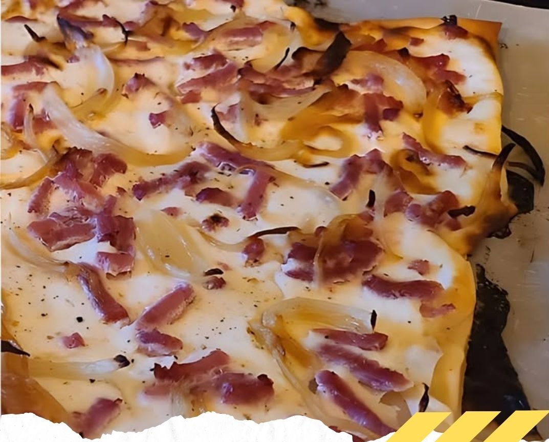 7. La flammekueche restera un peu liquide, c’est normal. Elle se solidifie en refroidissant.