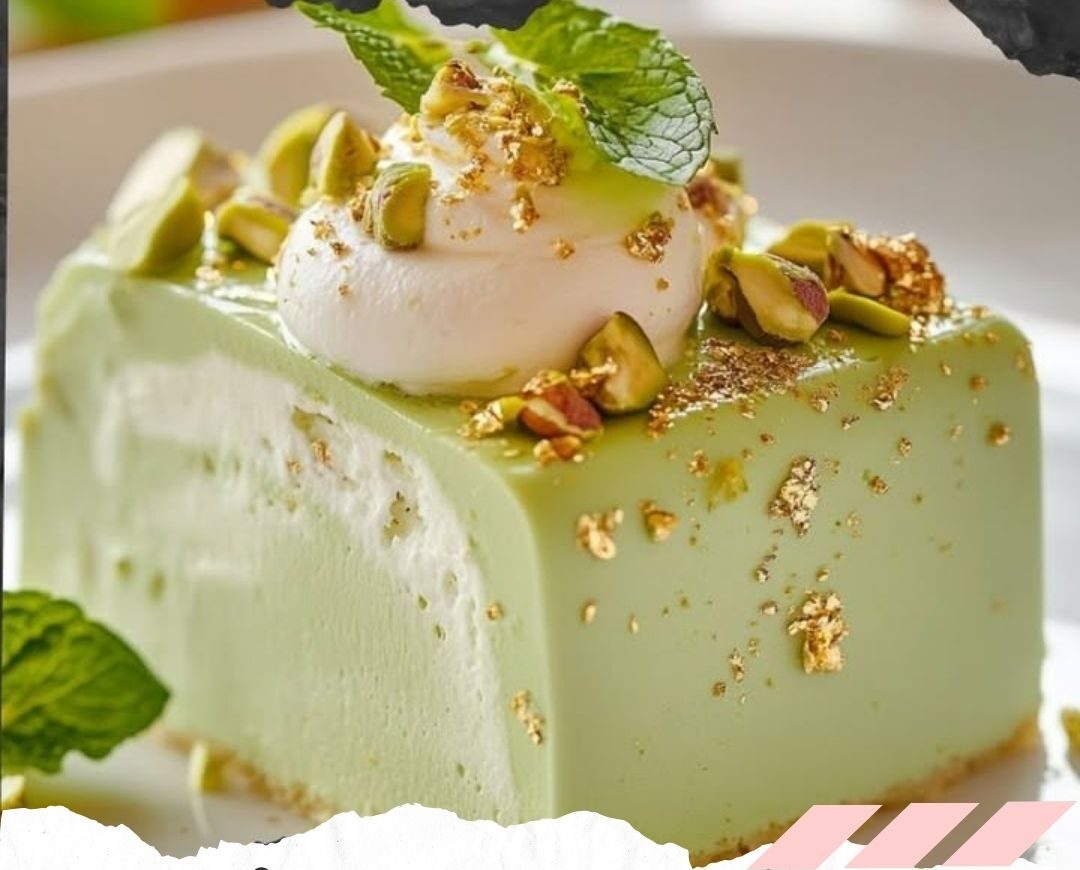 9. Replacez la génoise dans le moule à charnière. Versez la mousse à la pistache par-dessus et lissez la surface.