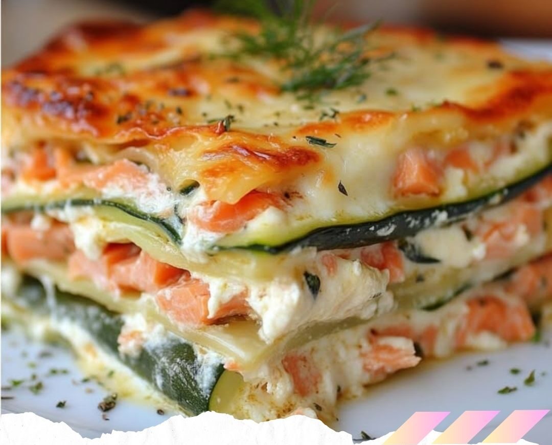 4- Terminez la dernière couche avec la béchamel, des courgettes et du saumon. Ajoutez aussi des flocons de beurre pour une croûte savoureuse.
