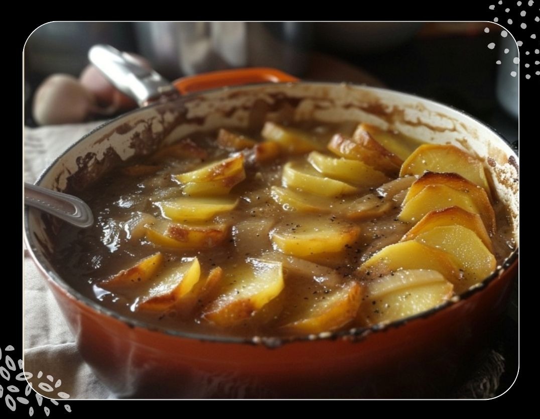 5- Ajoutez les pommes de terre, les oignons et les lardons dans la cocotte avec le bouillon.