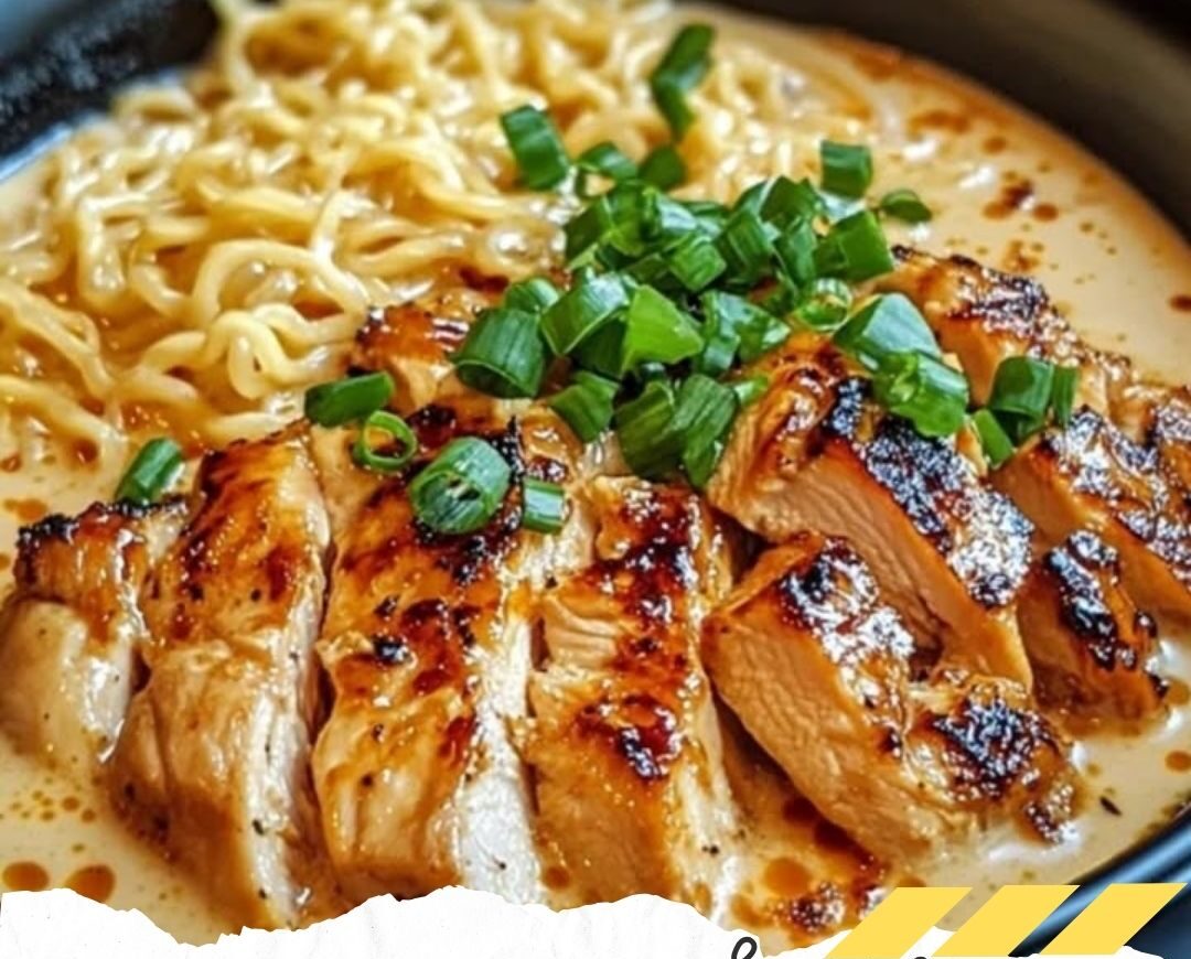 Ajoutez le poulet cuit sur les ramen crémeux et bien mélangez pour répartir la viande uniformément.