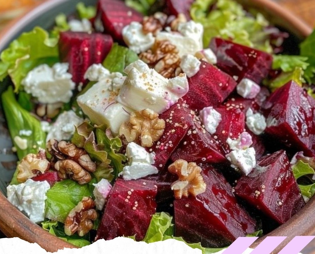 3- **Assemblage de la salade** : Dans un saladier, mélangez le quinoa cuit, la salade, les betteraves coupées en dés, le chèvre émietté, les noix concassées, et la vinaigrette.