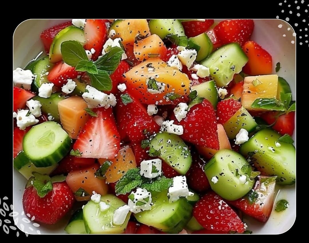 6- Dans un grand saladier, mélangez les fraises, le melon, le concombre et le fromage feta.