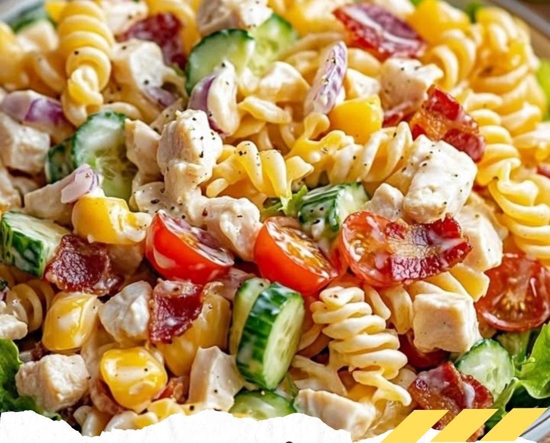 2. Préparer la salade : Dans un grand saladier, mélangez les pâtes refroidies, le poulet, le bacon, les tomates, la laitue, le concombre, le cheddar et l’oignon rouge.