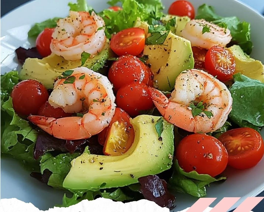 1- Dans un grand saladier, disposer le mesclun, puis ajouter les crevettes, l’avocat, les tomates cerises et l’oignon rouge.