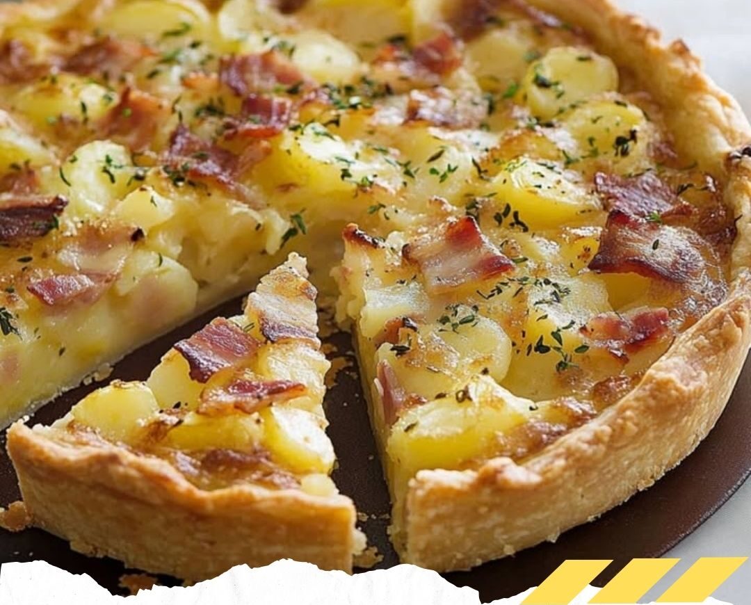 4. Montez la tarte : Étalez la pâte brisée dans le moule à tarte. Disposez les rondelles de pommes de terre sur le fond de tarte. Répartissez les lardons sur les pommes de terre. Versez l’appareil à quiche sur la tarte.