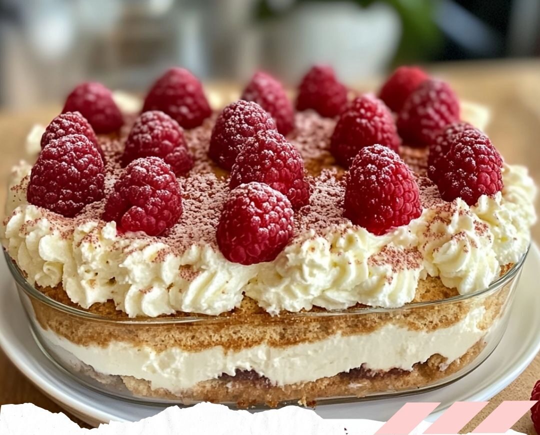Répéter : Répétez l’opération en alternant les couches de biscuits, de crème et de framboises jusqu’à épuisement des ingrédients, en terminant par une couche de crème.